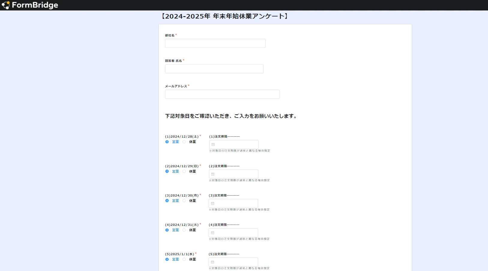 ▲パートナーに配布している長期休暇時の休業アンケート。入力すれば自動的に回答がkintoneに反映される。
