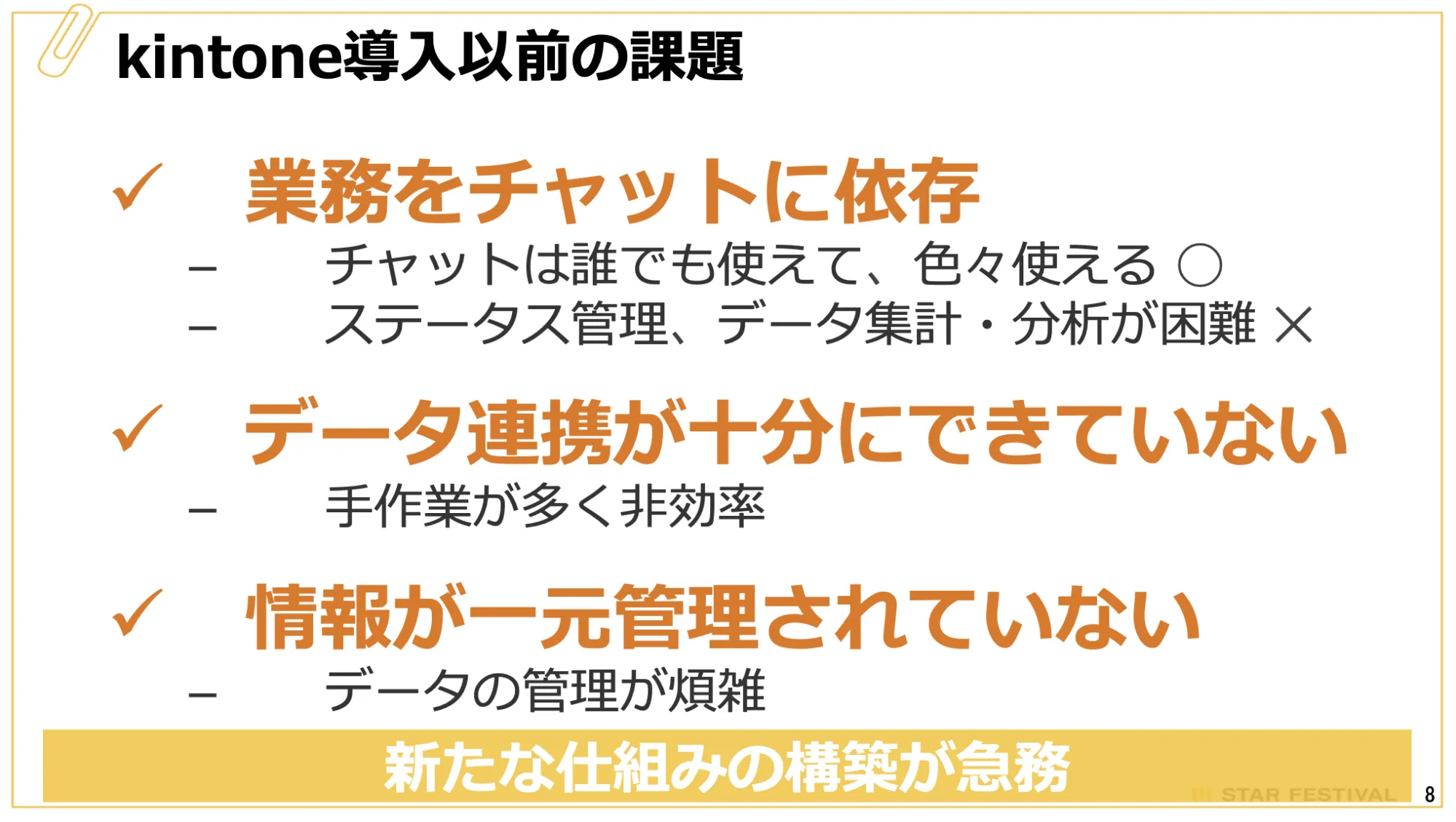 ▲kintone導入前はさまざまな課題が山積していた(出典:スターフェスティバル提供資料)