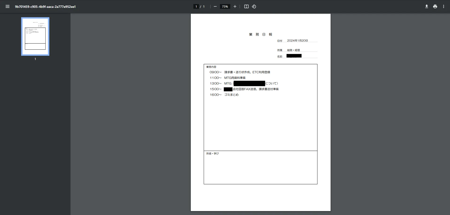 ▲PrintCreatorで出力した業務日報