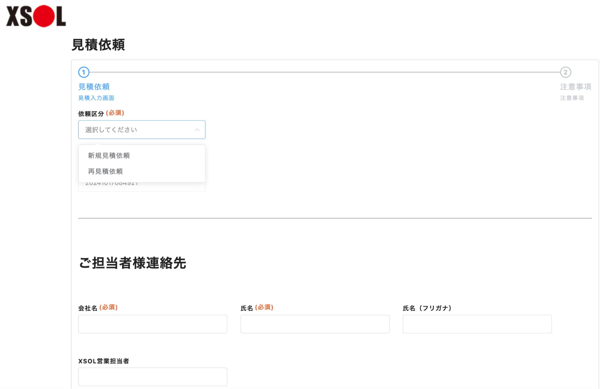 ▲FormBridgeで作成した見積依頼フォーム。依頼区分から再見積依頼を選択すると、その下にある問い合わせ番号の選択肢には、アクセスしたメールアドレスの担当者が入力した問い合わせ番号のみが表示されるようになっている。