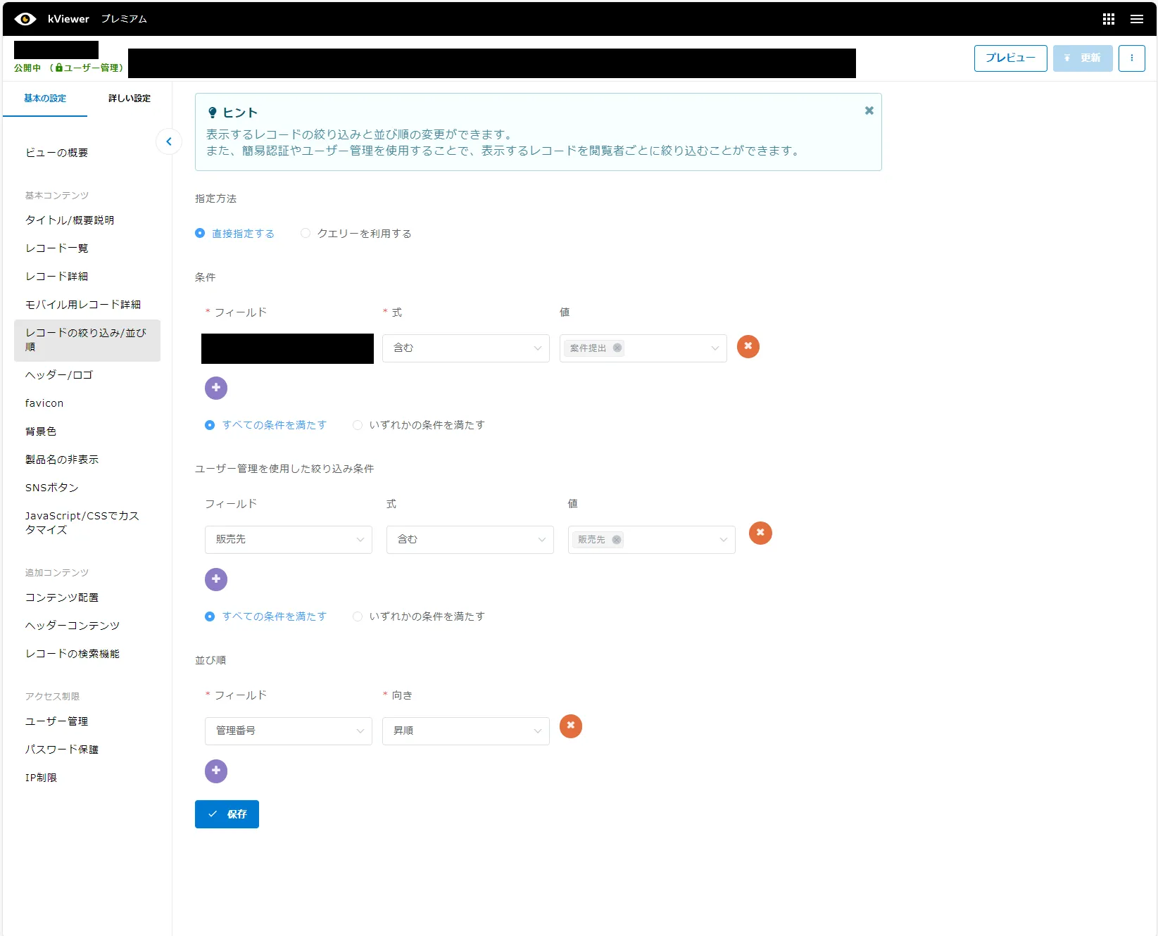 ▲ユーザー管理を利用したkViewerの絞り込み条件画面。条件からあらかじめユーザー管理に登録したユーザーを選択し、特定の問い合わせ番号のレコードのみが表示されるように絞り込めるようになっている。