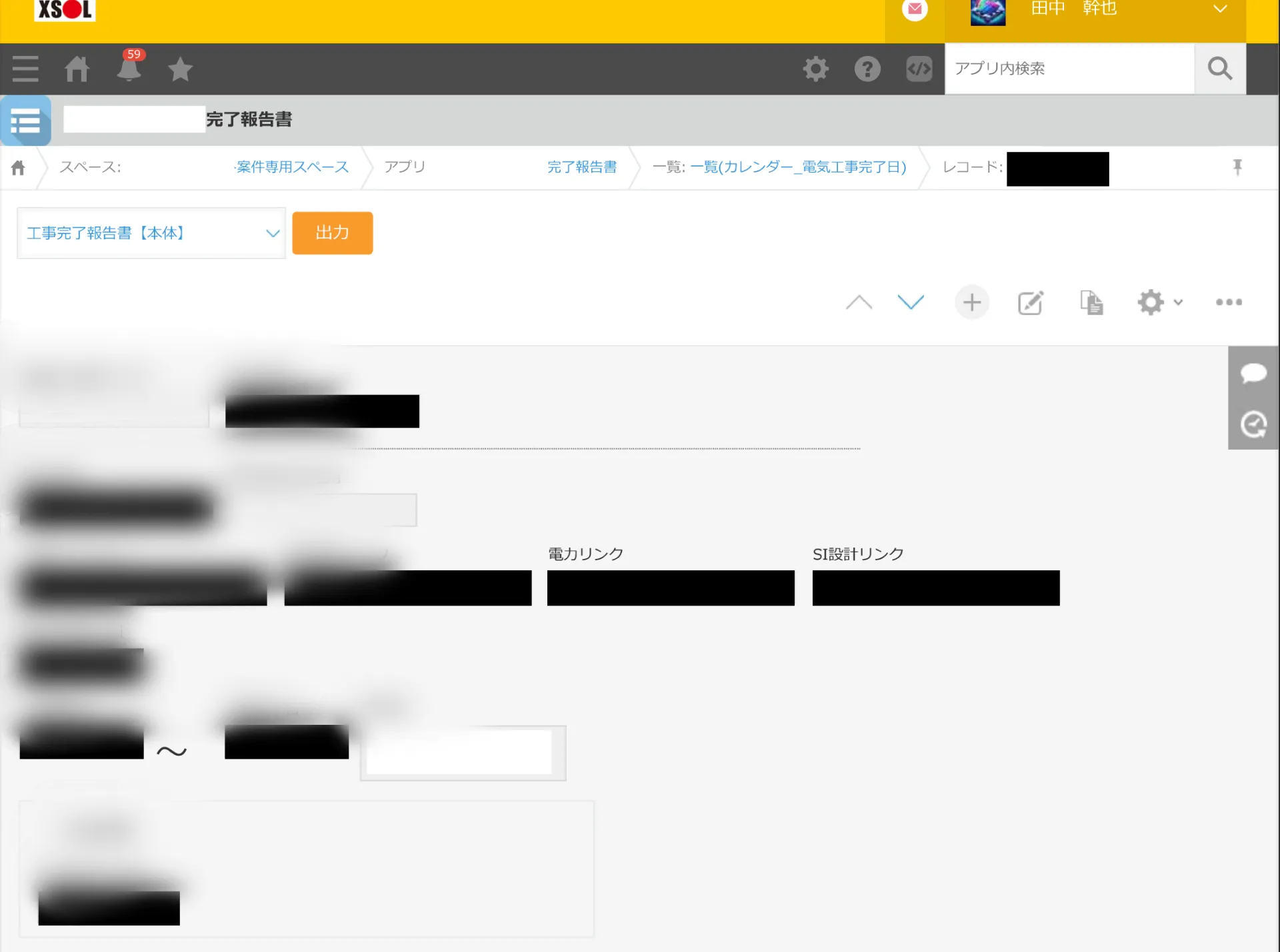 ▲工事完了報告書のkintone入力画面。出力ボタンを押すだけで簡単にPDF出力が可能に。
