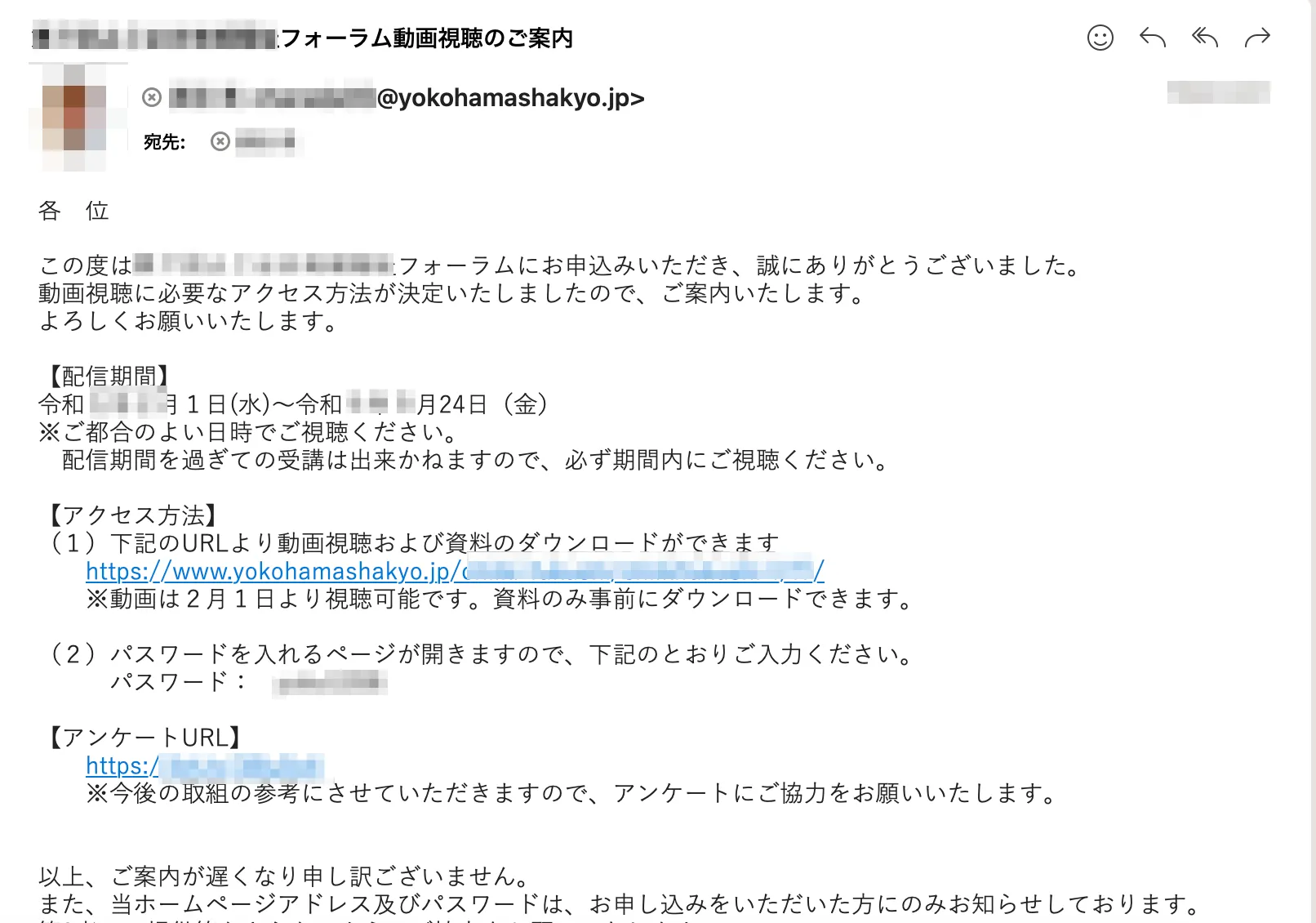 ▲公開講座の動画視聴の申込をFormBridgeで受け付け、申込者宛にkMailerで一斉送信したメール