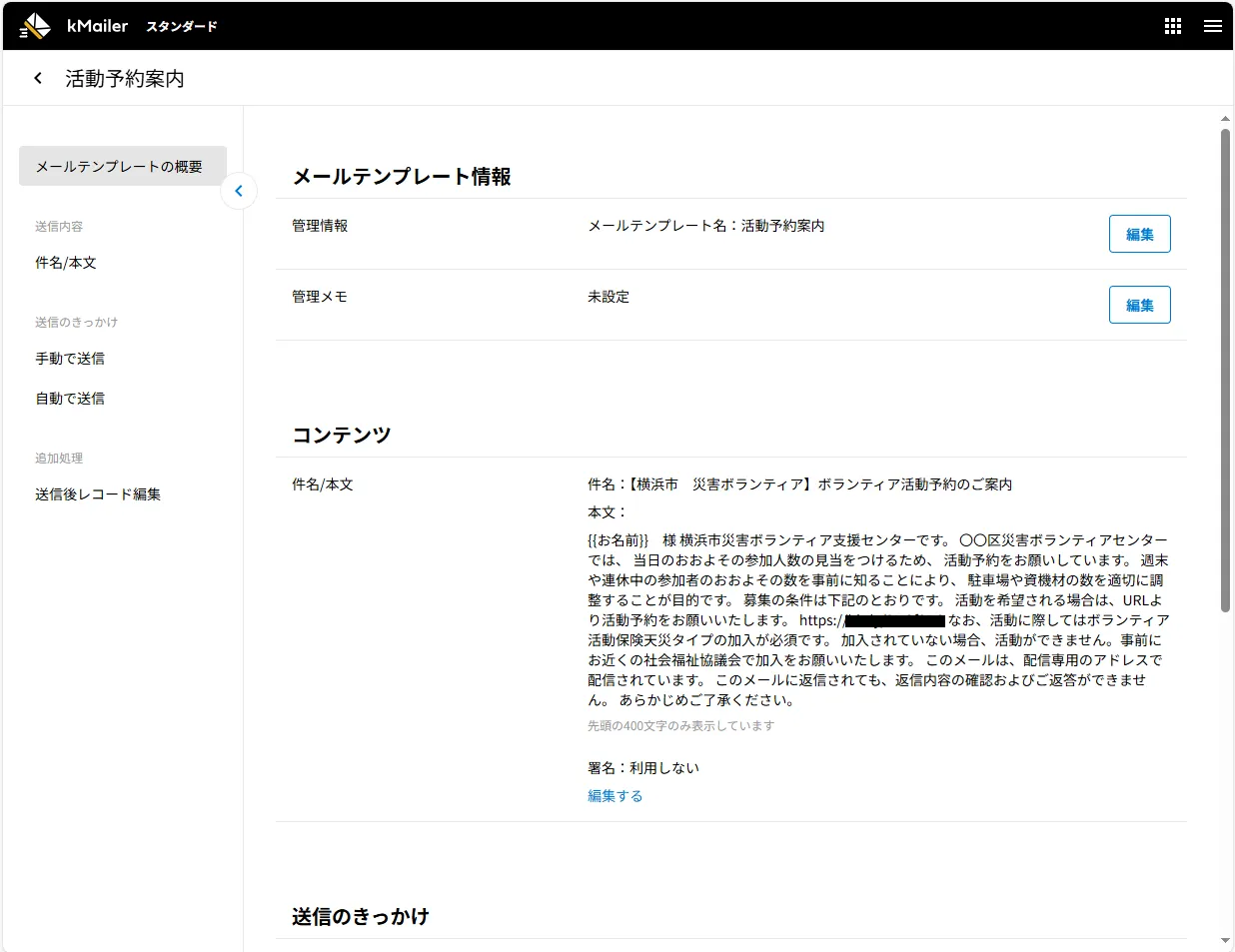 ▲kMailerで作成された災害ボランティア活動予約メールの設定画面
