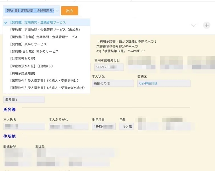 ▲PrintCreatorで出力した日常生活自立支援事業契約書。従来は一件ずつWordに手入力で作成していた