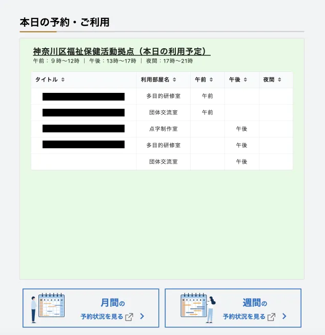 そこでkViewerを導入したところ、iframe用コードをホームページに埋め込むことで、月間の貸室予約状況を分かりやすく表示できるようになりました。