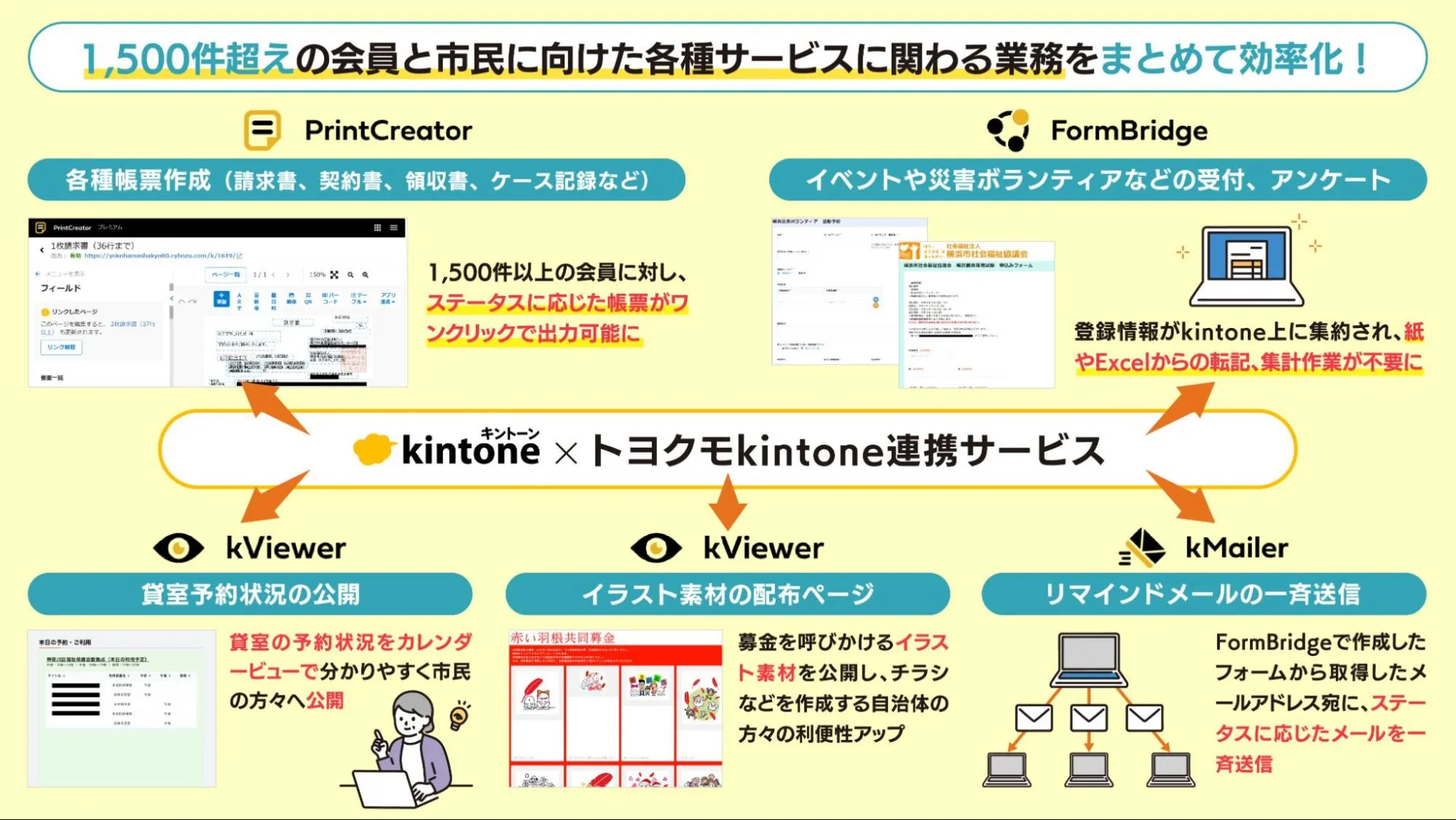 PrintCreatorの有用性を実感した同協議会では、さらなる業務改善を進めるべく、段階的に複数のkintoneトヨクモ連携サービスを導入していきます。