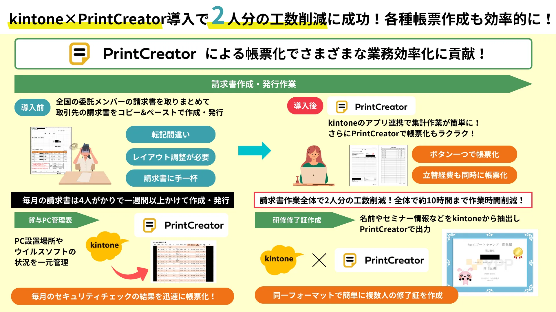 kintone×PrintCreatorで2人分の人件費を削減!1週間以上かかっていた書類作成業務が約10時間で完了!