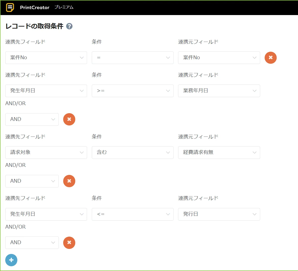 ▲請求書のPrintCreator設定画面。アプリ連携を利用し、連携元フィールドを「経費請求有無」にすることで、立替経費請求が発生した場合のみ、当該の帳票が出力されるように設定されている。