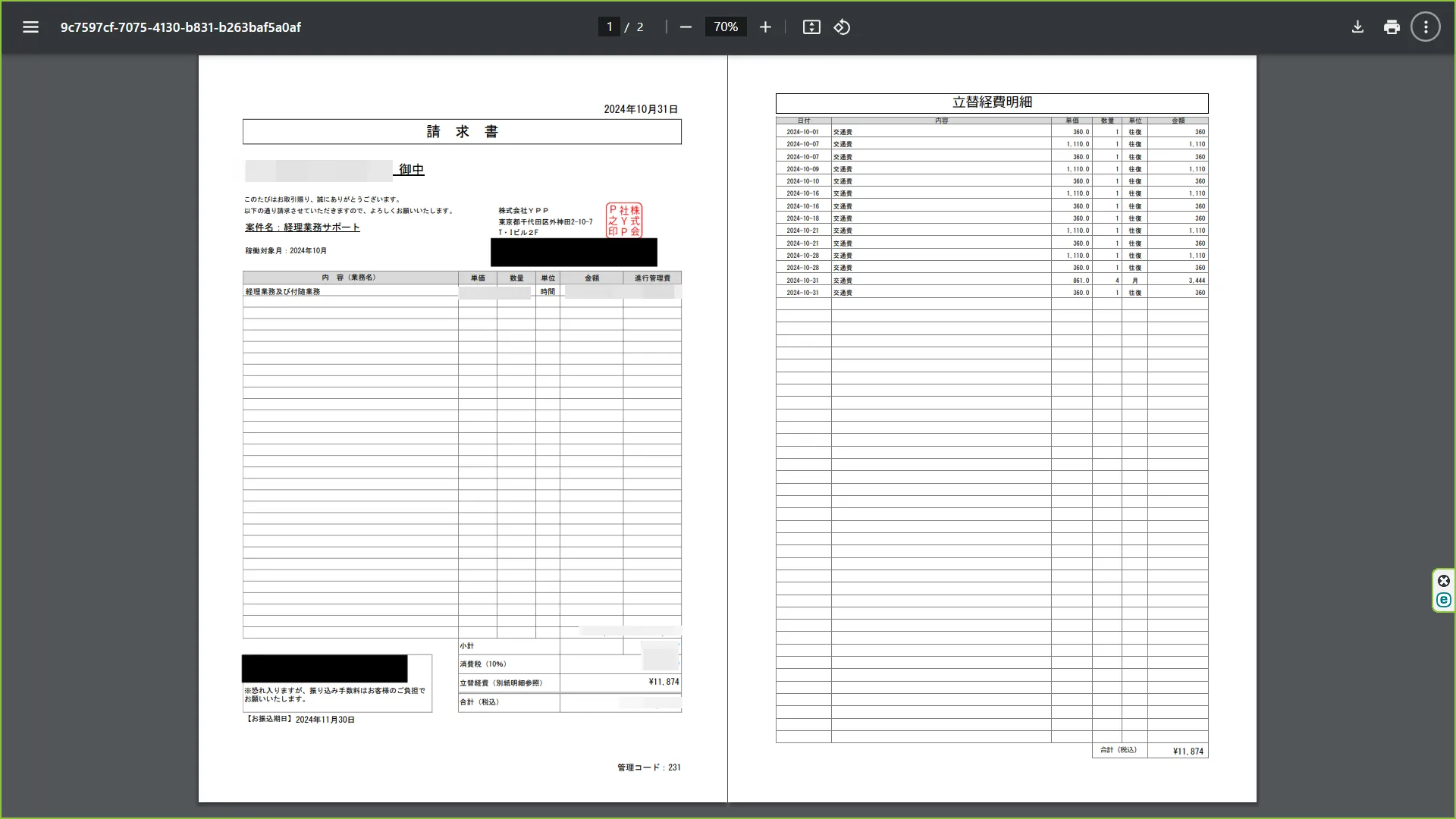 ▲PrintCreatorで作成した、立替経費明細の付随した請求書。立替経費が発生しない場合は右の帳票は表示されない。