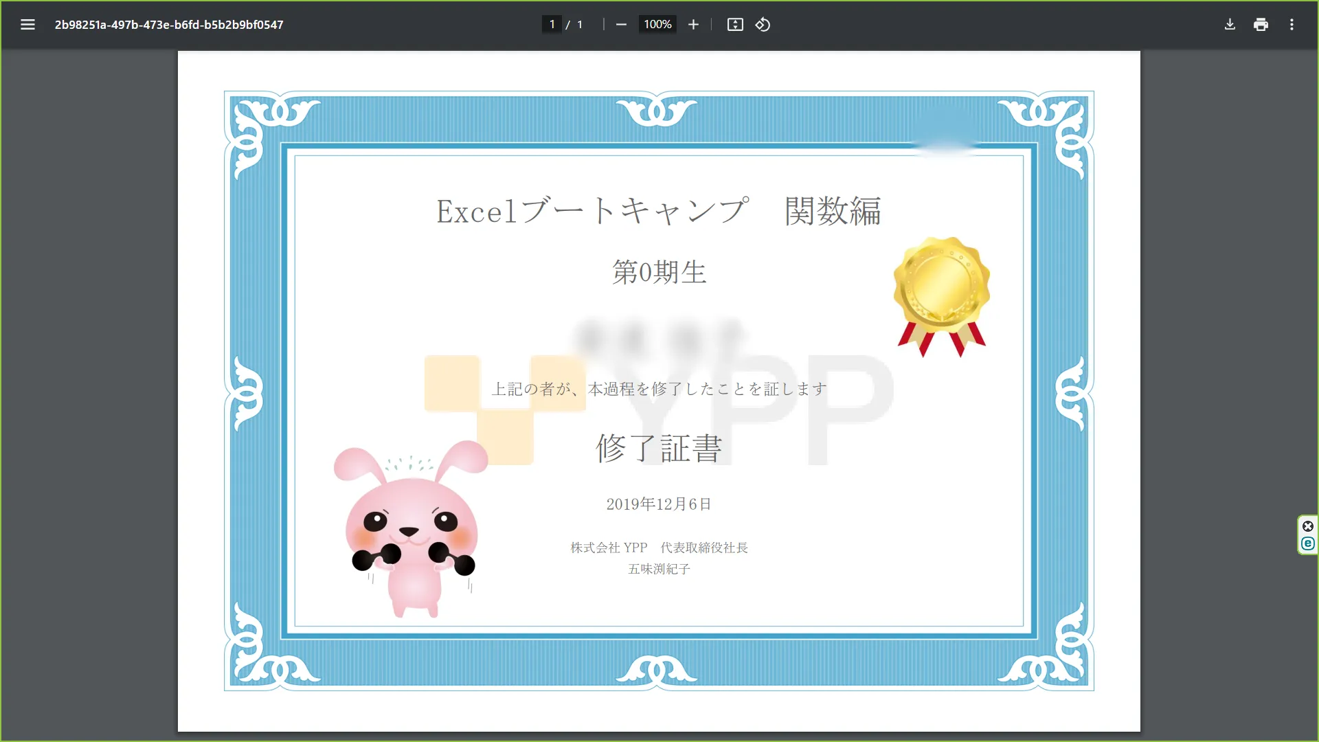 YPPでは委託先を対象にしたスキルアップ研修を行っています。その際の修了証の発行にPrintCreatorをご活用いただいております。お名前やセミナー情報などをkintoneから抽出することで、同一フォーマットで簡単に複数人の修了証を作成できるよう工夫されています。
