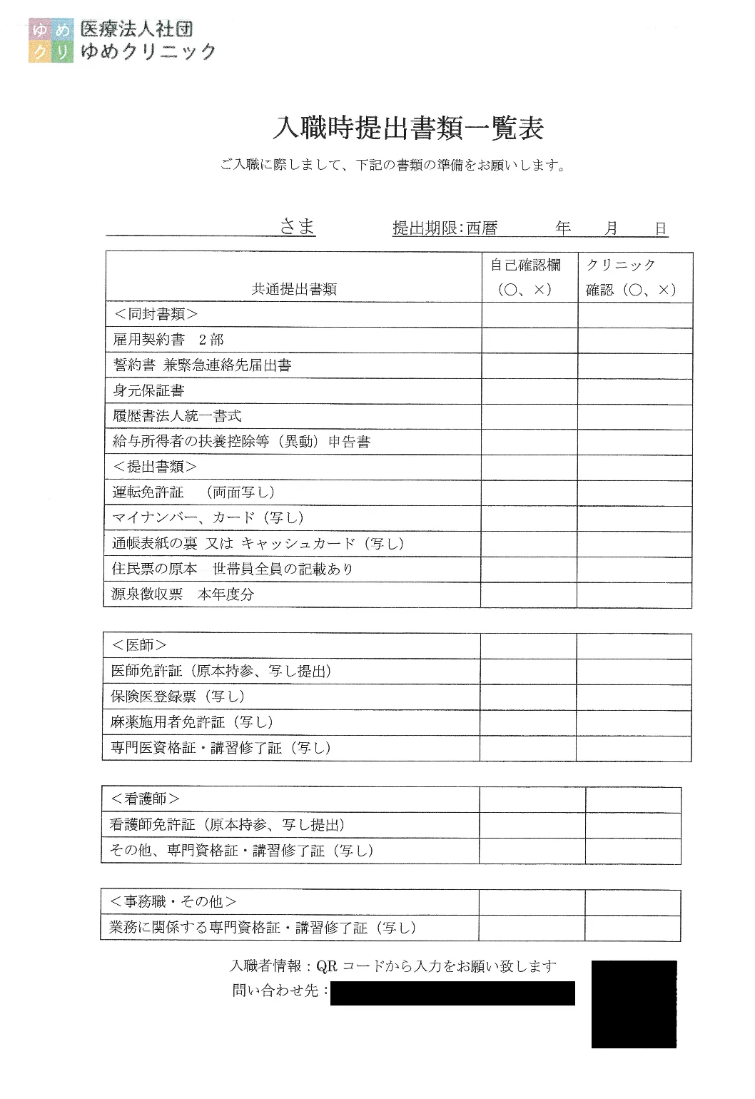 ▲入職時に送付する書類の一部。黒塗り部分に入職者情報を入力するFormBridgeのフォームURLのQRコードを掲載