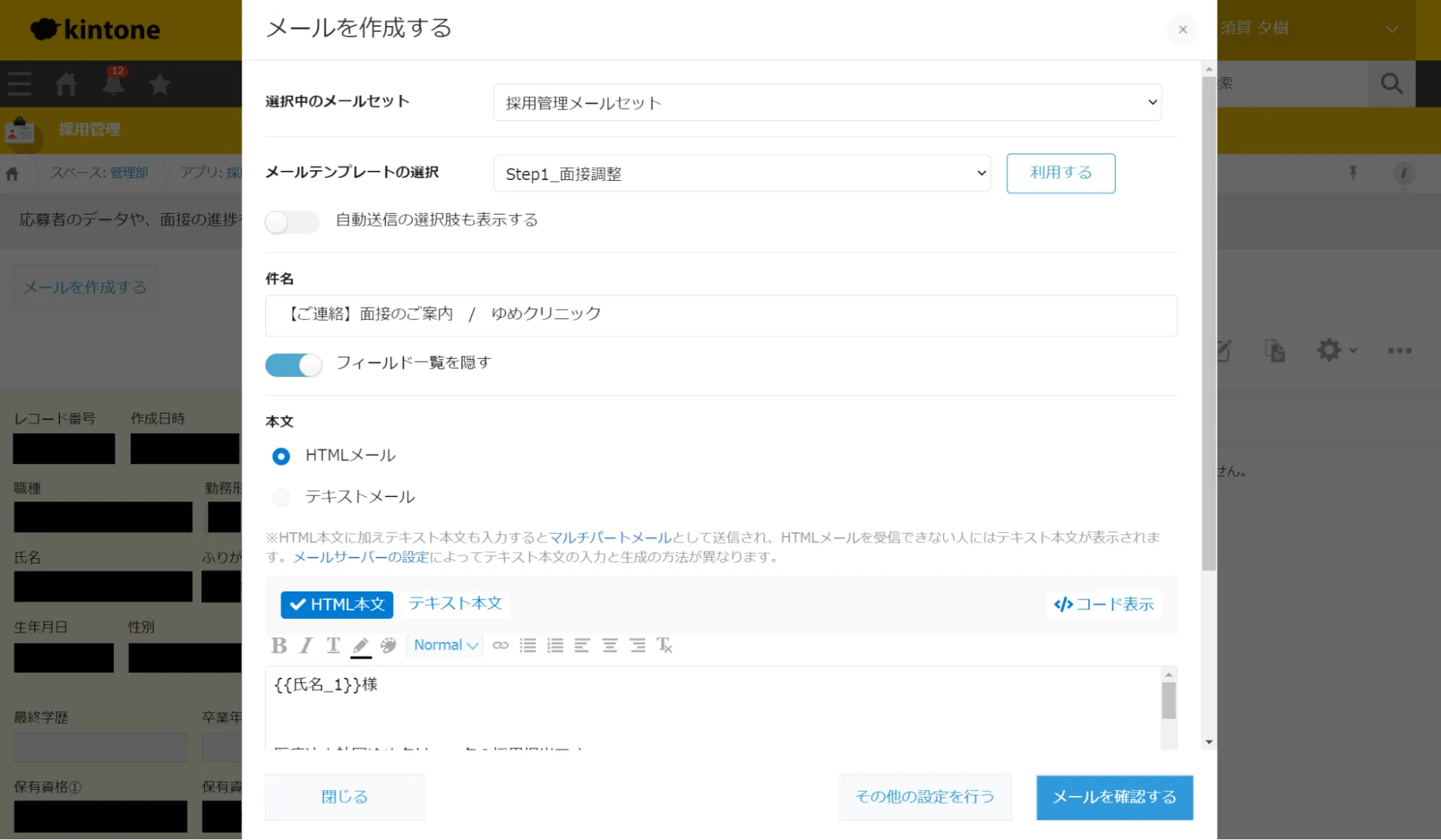 「上記応募フォームにアクセスできるボタンを、ゆめクリニックHPにある採用ページに設置しています。問い合わせがあれば自動的にkintoneアプリにレコードが追加されるのでが作成され、kMailerで返信を行っているというフローに変更しました。