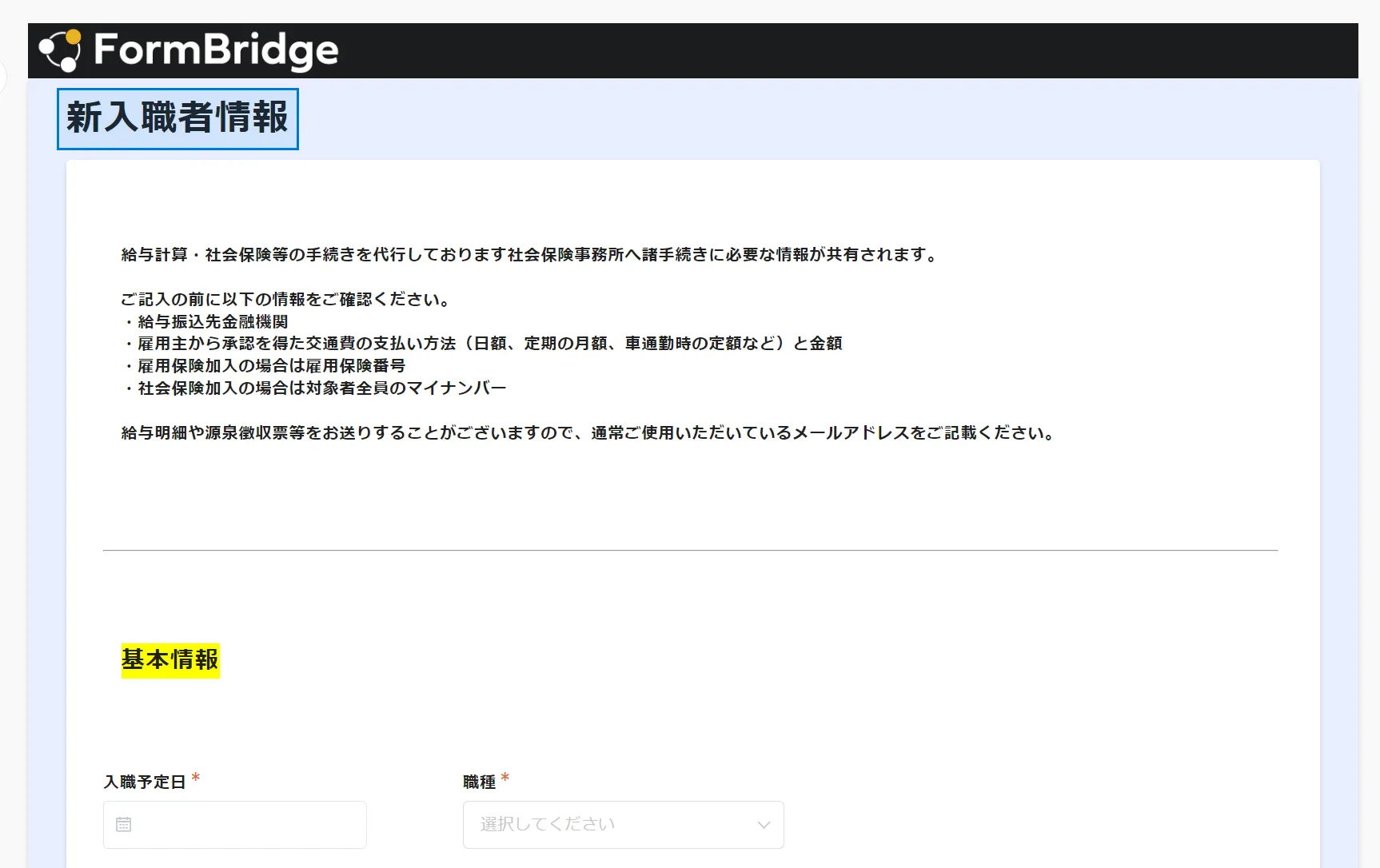 また入/退職時の職員情報の管理にも、FormBridgeが活用されています。入職時は個人情報や口座情報などさまざまな情報を取得する必要があります。