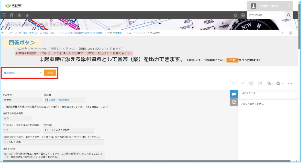 そこで、PrintCreatorであらかじめ起案用の様式を用意しました。照会業務の回答が完了したあとはkintoneの画面上から出力ボタンを押すだけでPDFが出力されるようになり、それをそのまま起案に添付できるようになりました。