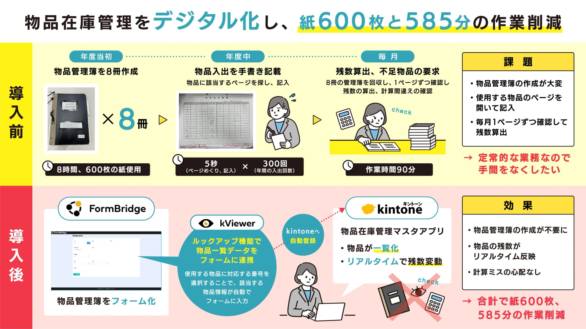FormbridgeとkViewerを導入することで、物品管理簿に使用していた約600枚ほどの紙が不要となり、管理簿の作成から各職員による入出記録、不足物品の確認や計算にかかっていた585分(9時間45分)の作業時間が削減できました。