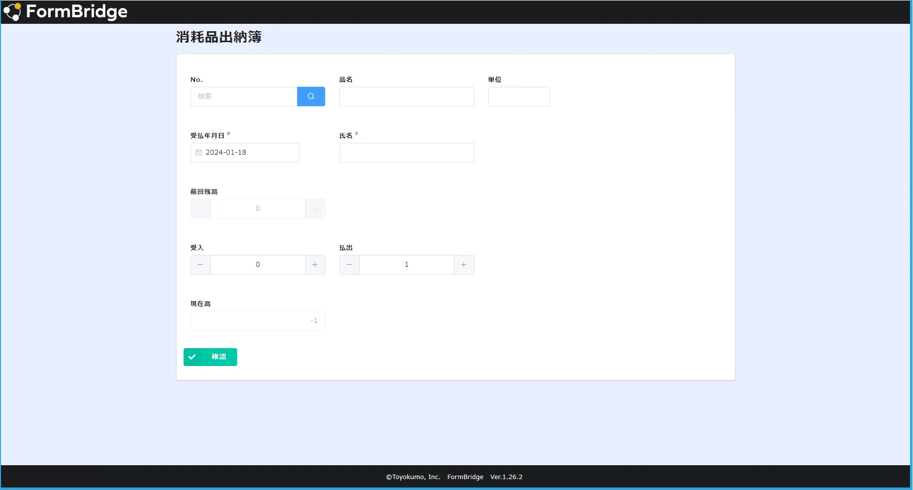 さらに、kViewerと連携させ、kViewerルックアップ機能をフォームに搭載。使用する物品に対応する数字を選択するだけで、物品名や前回残高などの情報がフォームに自動挿入されるように実装しました。