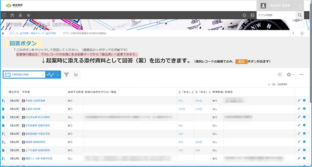 各課の提出状況や回答内容の確認も一つの画面で行える