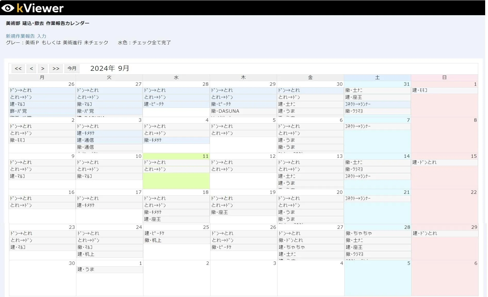 kintoneに登録された内容はkViewerで作成した作業報告カレンダーに反映され、1日の作業予定や「どの番組からどの番組への移行作業があるのか」という点を確認できるようになります。