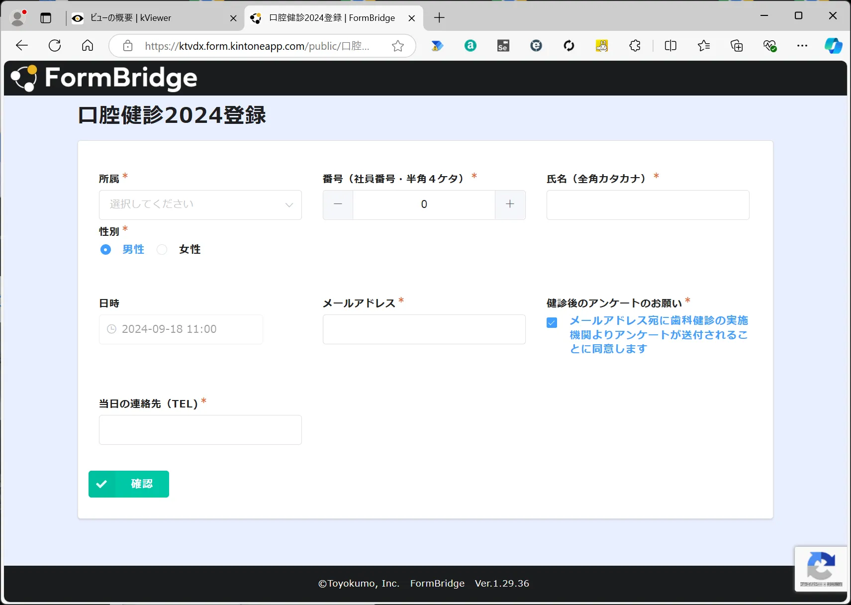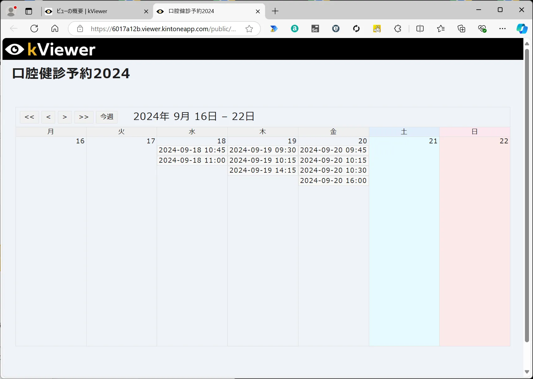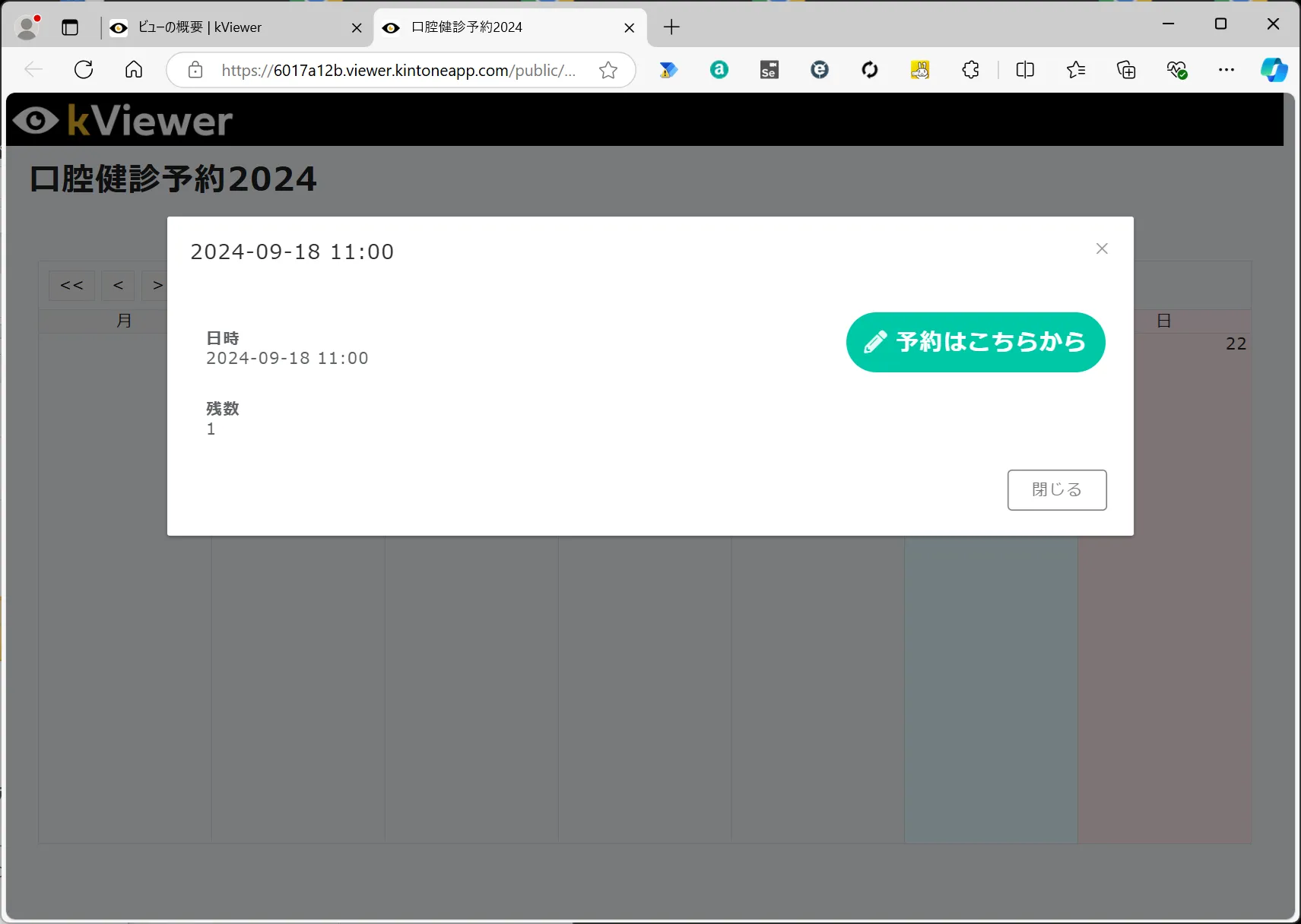 その一例が社内の健診予約です。全社に共有されたkViewerのURLへアクセスすると、席数に空きのある日時がカレンダービューで表示されています。社員は表示された日時の中から、希望の日時を選択し、予約ボタンを押すとkViewerからFormBridgeに遷移します。
