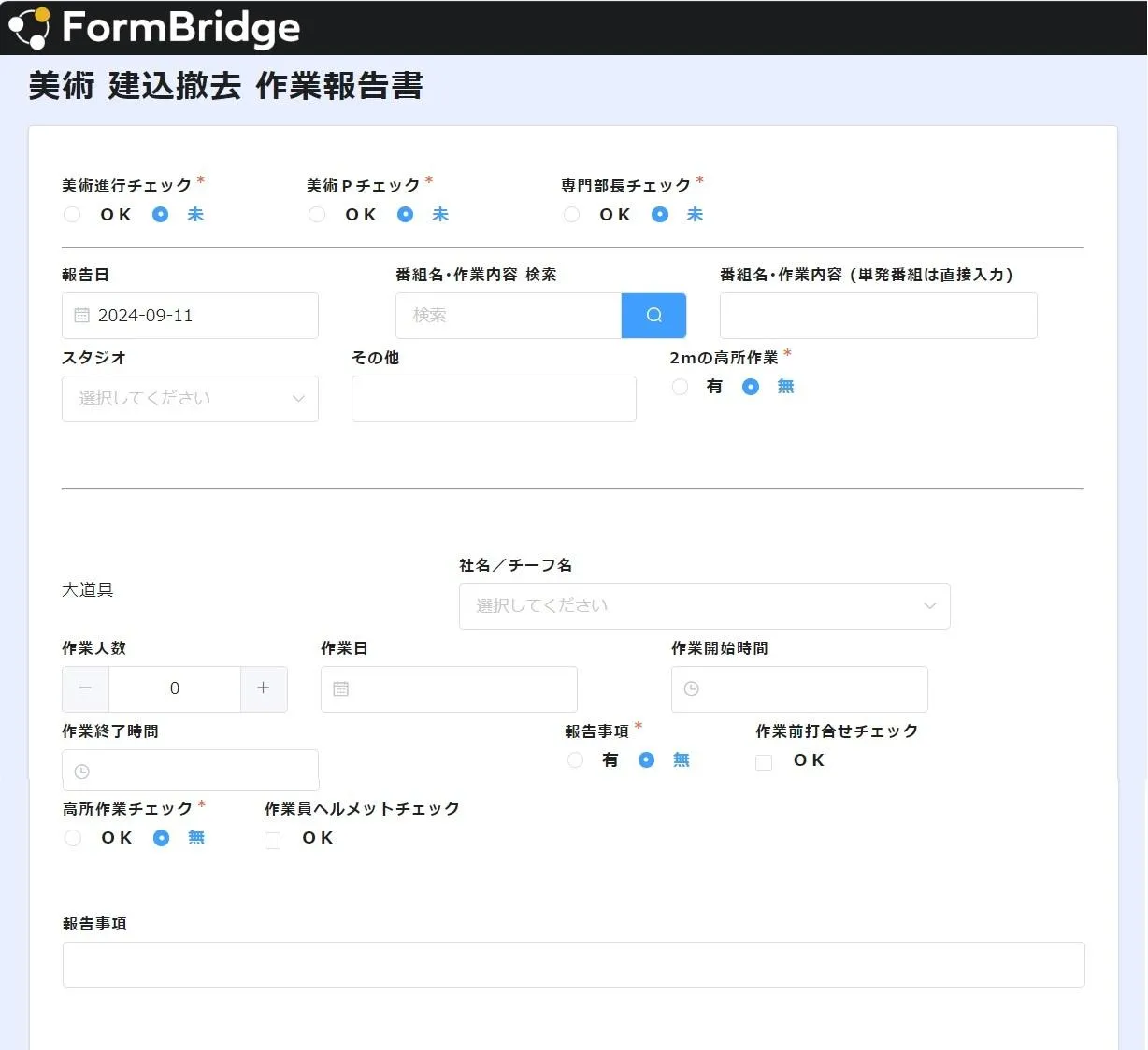 その後、セットの組み立てや撤去を行う際に、カレンダーに表示された該当の作業をクリックすると、FormBridgeで作成した作業報告の入力フォームに遷移。各担当が、作業人数・時間・安全確認チェックなどを入力します。