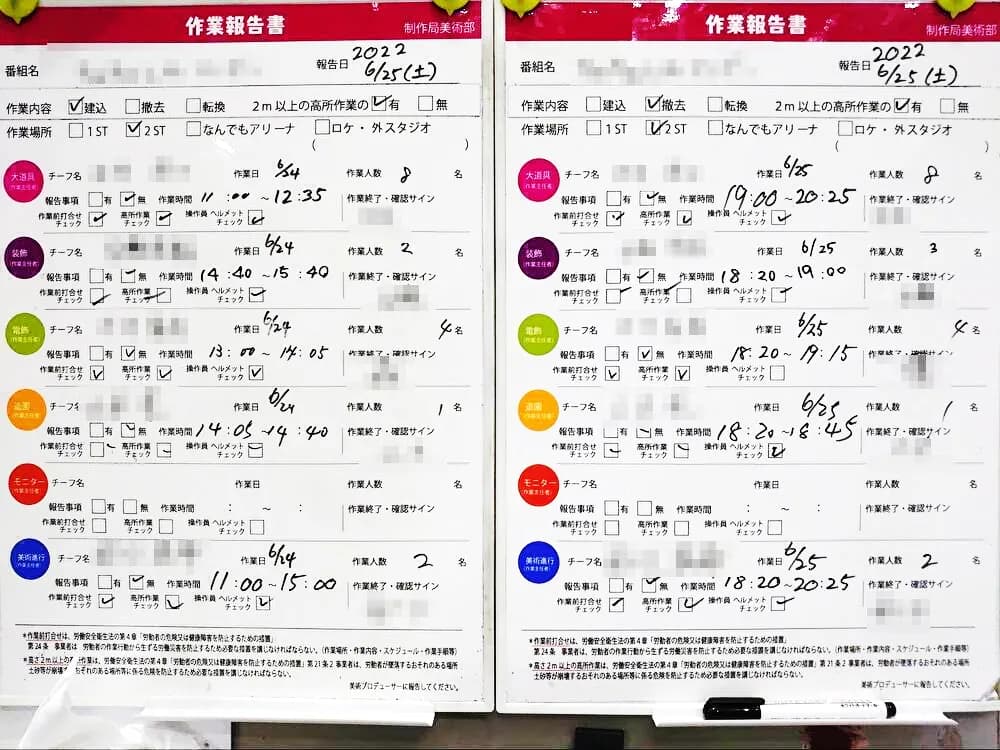 美術部は、番組収録を行うスタジオのセット設営や撤去を行っており、ほぼ全ての作業を外部の業者に委託しながら業務を行っています。業者は、法律に基づいて安全対策や作業の実施時間などの情報を美術部の責任者に報告しなければなりません。以前は、この作業報告をホワイトボード上で実施し、記入内容をスマートフォンのカメラで撮影。その後、責任者に撮影画像をメール送信し、画像ファイル上で確認を実施し、チェックの完了後は、ファイル名を変更し、番組や実施月ごとにフォルダを分けて、該当のフォルダ内に格納していたそうです。