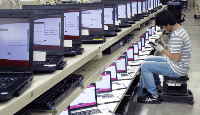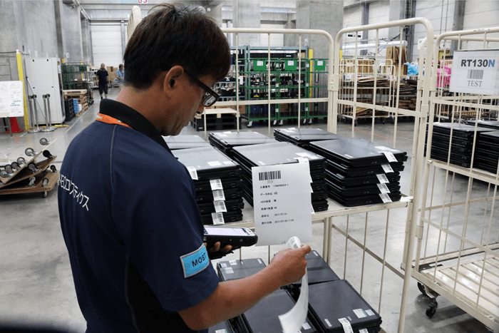 キャピテック&リブートテクノロジーサービス株式会社 倉庫検査エリアにて、PCの動作状況を確認中