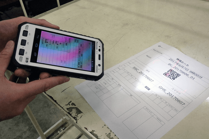 もう一つは、倉庫作業で利用しているQRコード印刷です。入荷作業の際に、kintoneで検品IDを振り出して、このIDを基幹システムへ入力する工程があるのですが、手入力だと間違えてしまったり、入力が面倒だったりするので、これを入荷作業で使用するシートにQRコードで出力し、ハンディで読み込むようにしています。検品IDを正しく一発で入力できて助かっています。」
