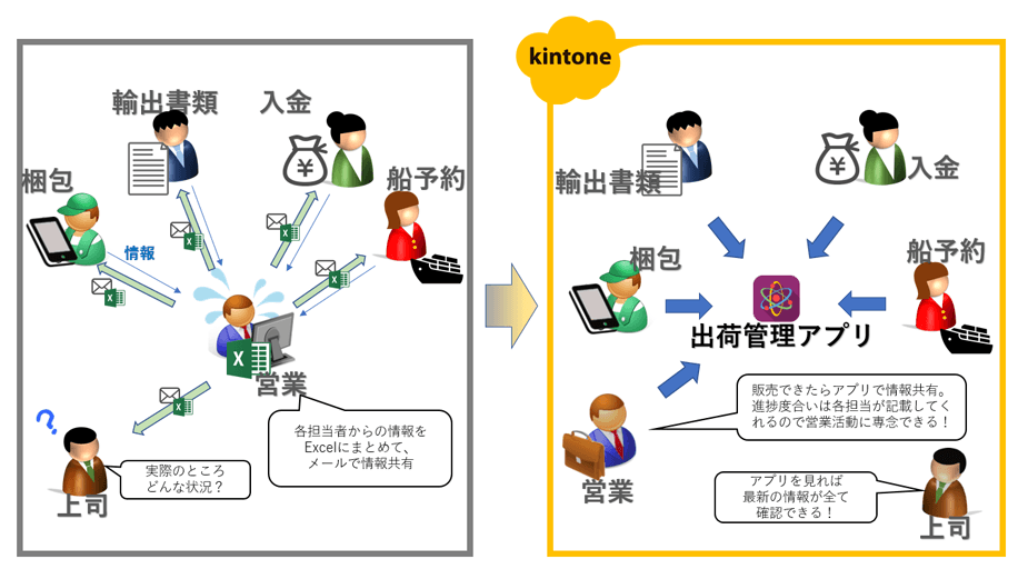 「現在では購入申請や、支払管理、休暇申請など、ありとあらゆる業務をkintoneで行いその便利さを実感していますが、初期段階でみんなに便利だなと実感してもらえたのは出荷管理に使っているアプリですね。出荷には船の予約状況や、梱包作業の期日、お客様からの入金情報等、様々な項目を確認しなければならないのですが、以前はだれか一人がこれらの情報を集めて、個人のExcelシートで管理して、定期的にメールで配信するなどして共有していました。これらの情報を全てkintoneで管理することによって、いつ誰が見ても最新情報を確認できる状況を作れました。」