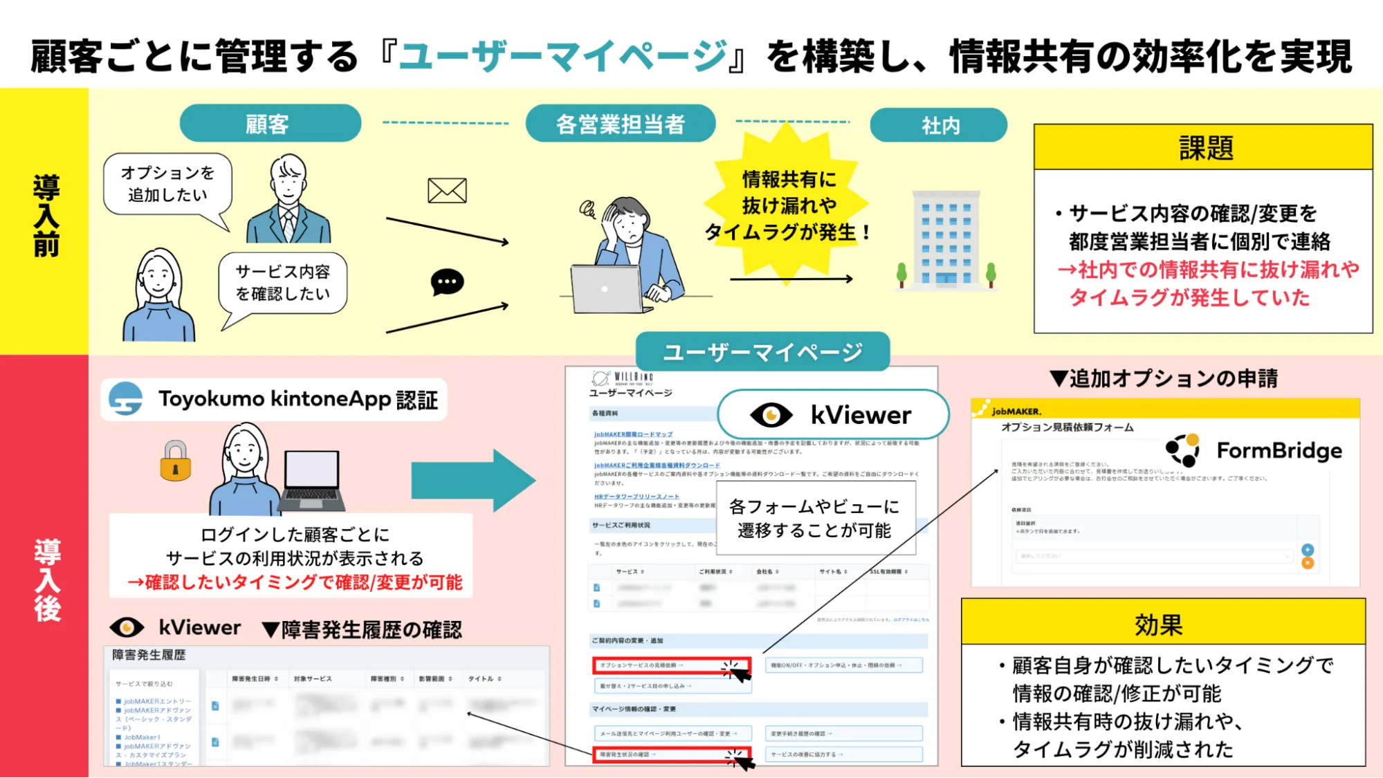 実は、山本氏にはToyokumo kintoneApp認証を利用して、顧客のマイページを構築したい、という希望がありました。しかし、それだけでプロフェッショナルプランへのコースアップが憚れたため、営業担当の課題が出てきたので、「これはいい機会だ」とアップグレードしました。そのおかげで、ユーザーごとに情報を管理して共有する「ユーザーマイページ」の仕組みを作成できたとのことです。