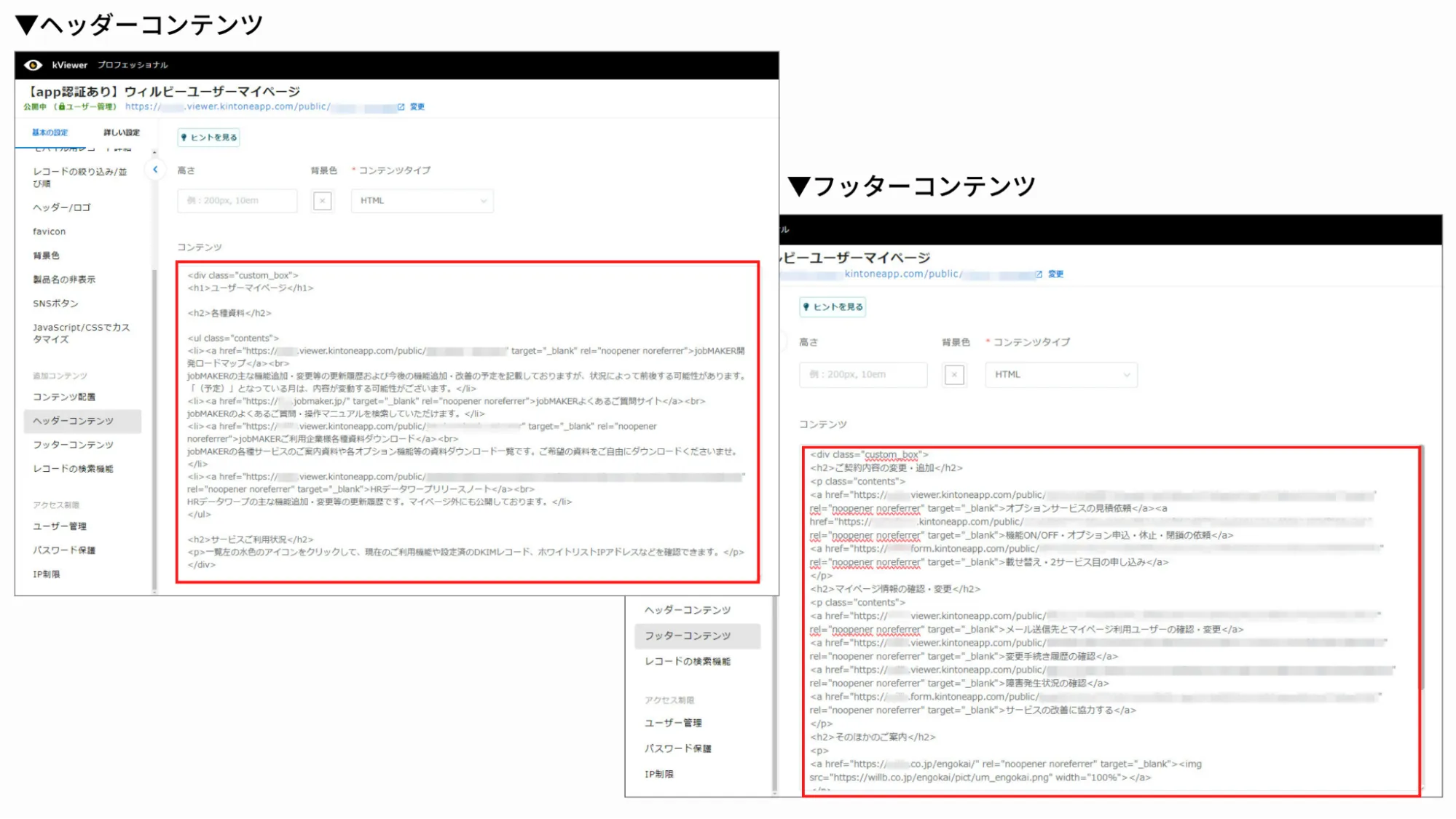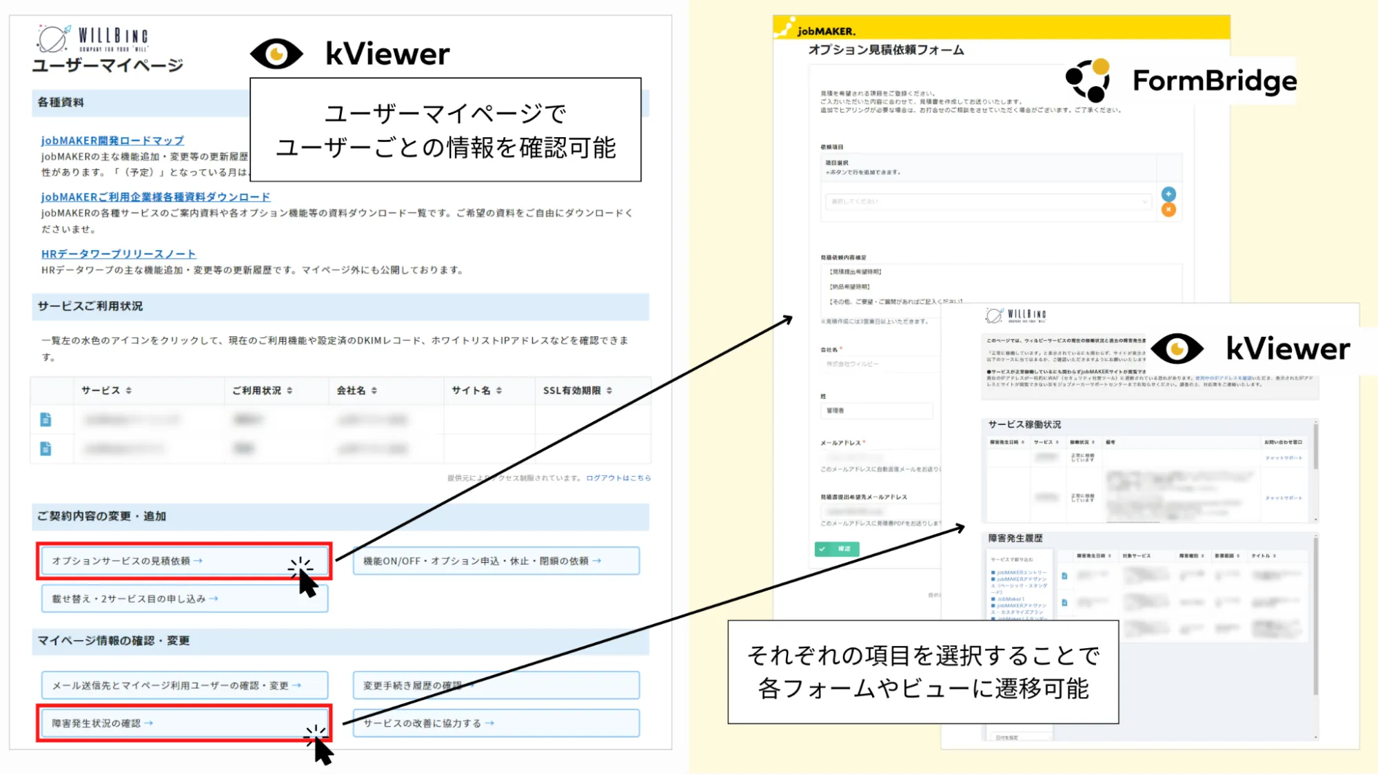 ユーザーマイページは、kViewerのリストビューを活用し、kintoneで管理する「サービスご利用状況」をユーザーごとに確認できるページとなっています。ユーザーマイページのヘッダーやフッターに、HTML/CSSを記述することで、各申し込みフォームやビューへ遷移させるように見栄えも工夫されています。