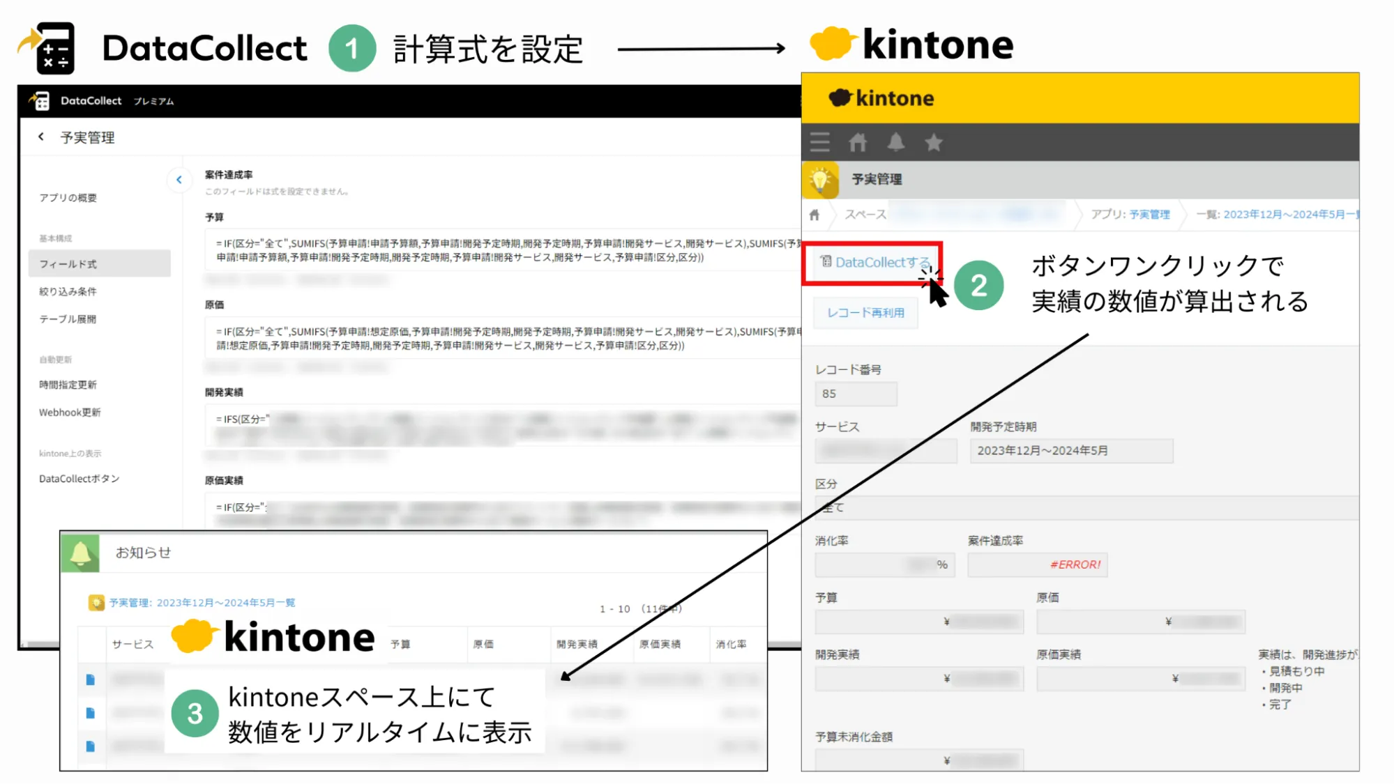 DataCollect|フィールド式の設定 | フィールド式とは、kintoneアプリの1つのフィールドに対して、「どこからデータを収集し、どのように計算して更新してほしいか」を指示するための式です。Excelの関数と同様の手順で設定できます。集計元のデータは複数のアプリから設定できるので、さまざまなアプリに散らばっている情報を集計対象とすることが可能です。 |