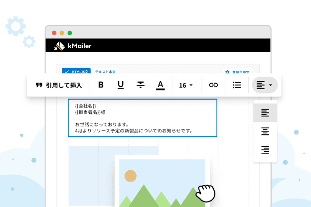 誰でも簡単にHTMLメールを作成できます。ご案内メールや請求書の送付など、見た目を整えることで受信者に安心と信頼感を与えられます。