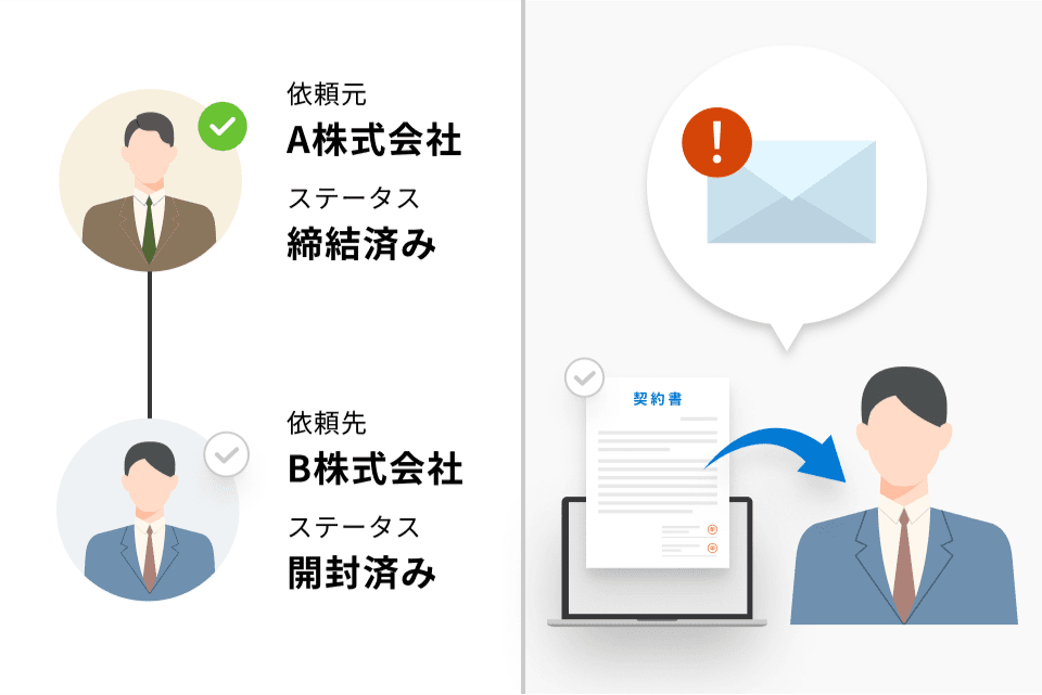 メール開封・書類の閲覧といった、契約依頼先の行動をkintoneのフィールド内に自動反映するので、細かな進捗確認が可能になります。また、未締結の電子契約に対して依頼先にリマインドメールを自動で送信できる機能も備わっています。