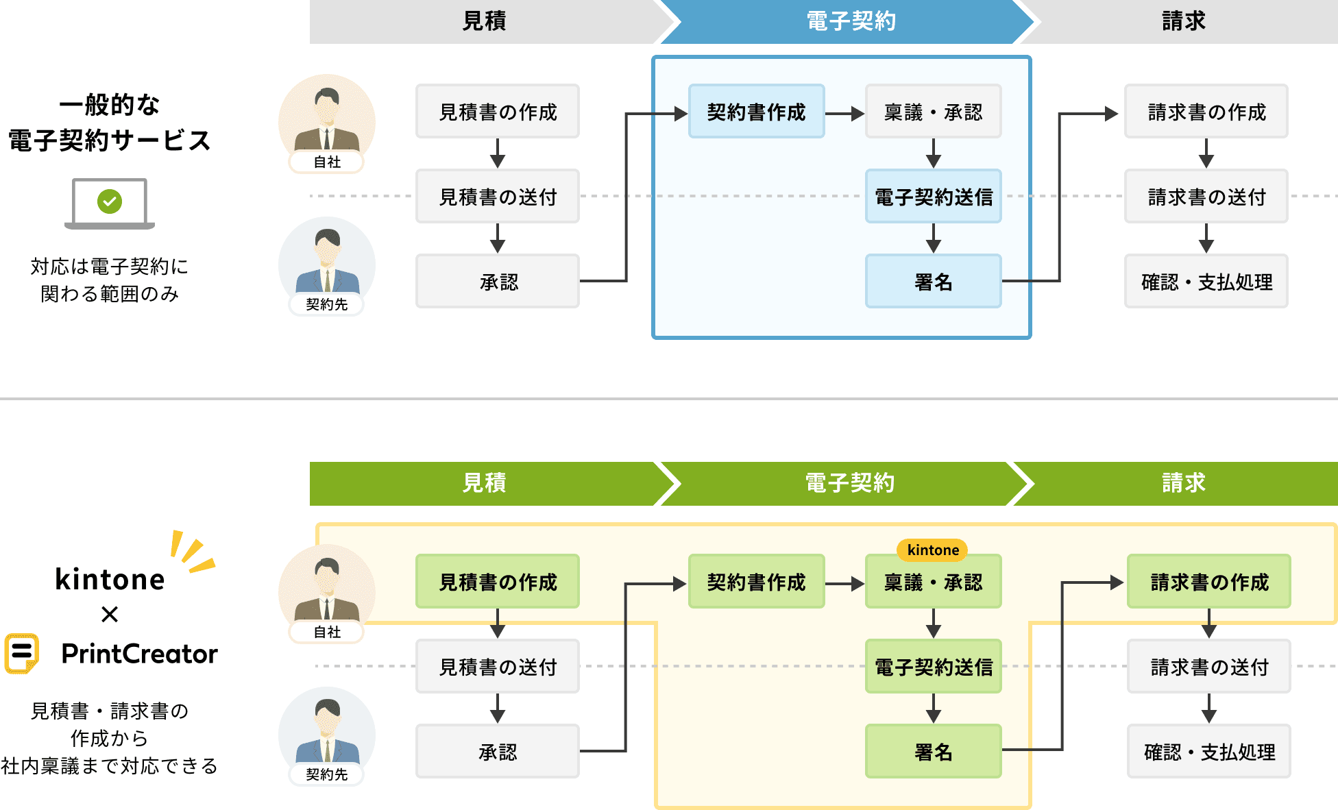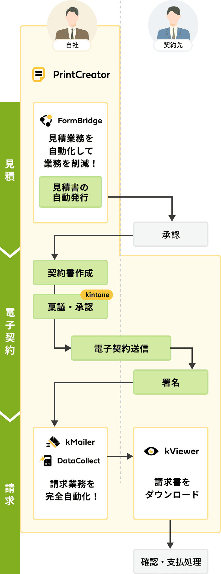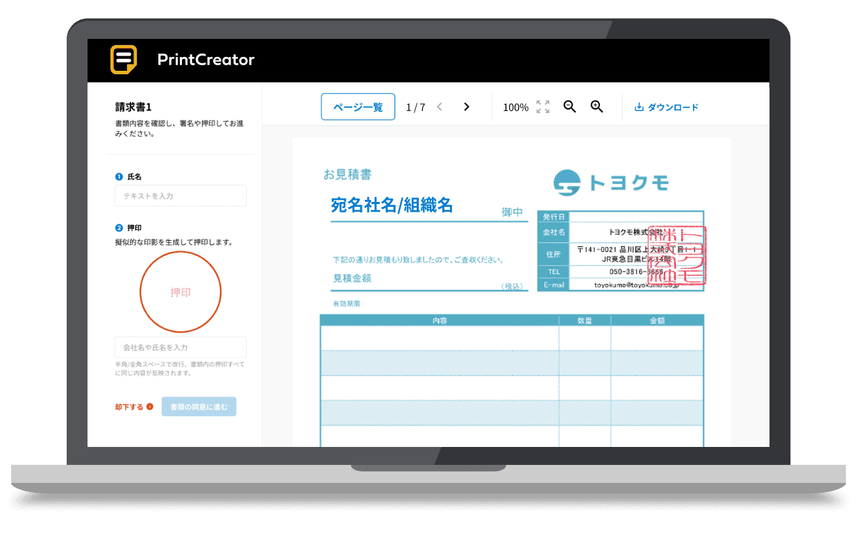 PrintCreatorなら、取引先との電子契約締結はもちろん、見積書や請求書などの書類作成から送付まで一気通貫で対応可能。