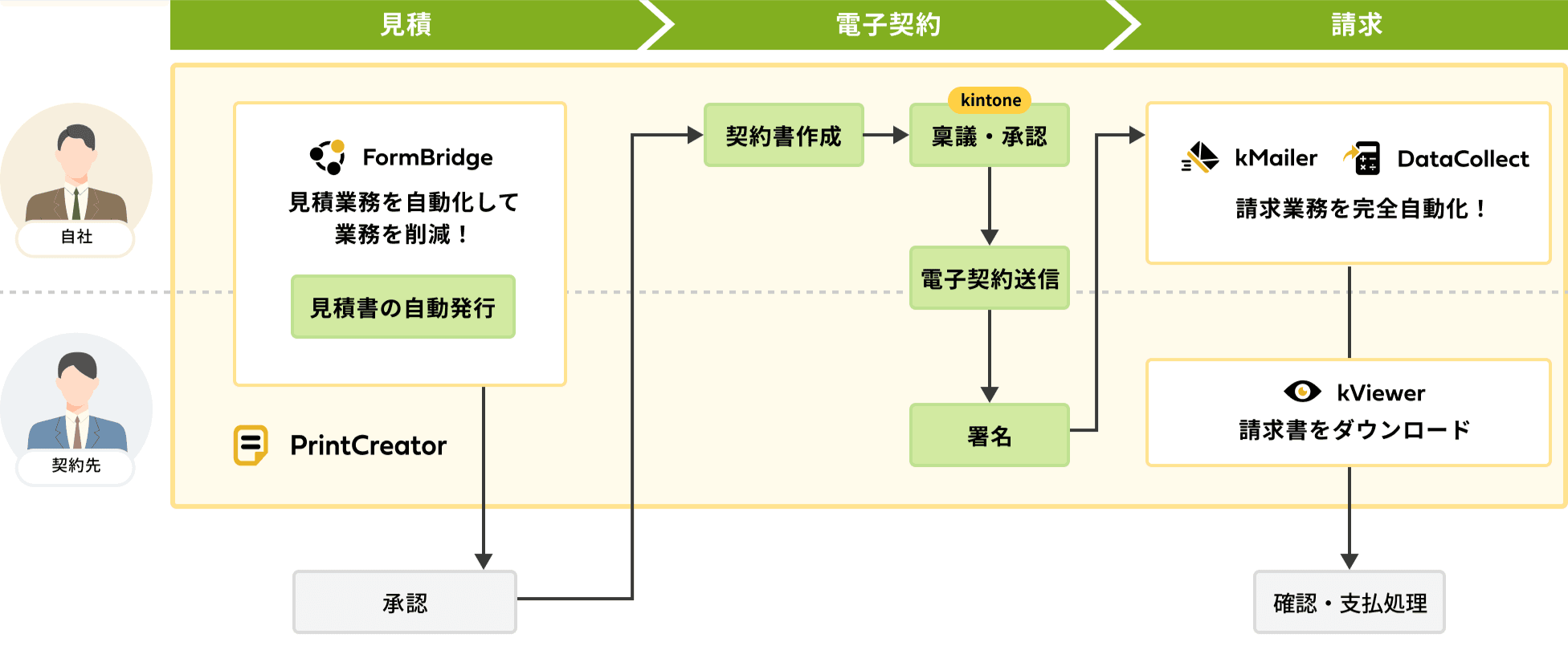また、FormBridgeなどトヨクモが提供する他のkintone連携サービスと組み合わせて使えば、 契約業務のフローそのものをさらに自動化・効率化することが可能です。