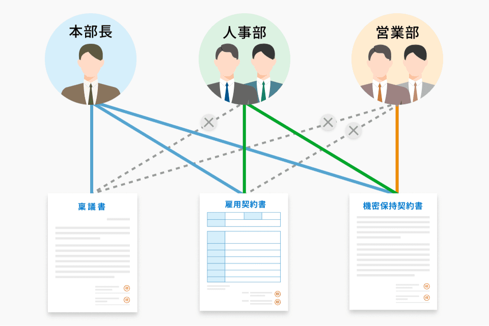 一部の人だけが見るべき書類に対して権限の設定が可能です。例えば、特定の部署/人だけに書類の出力や契約業務の権限を付与することで、ガバナンスを強化できます。